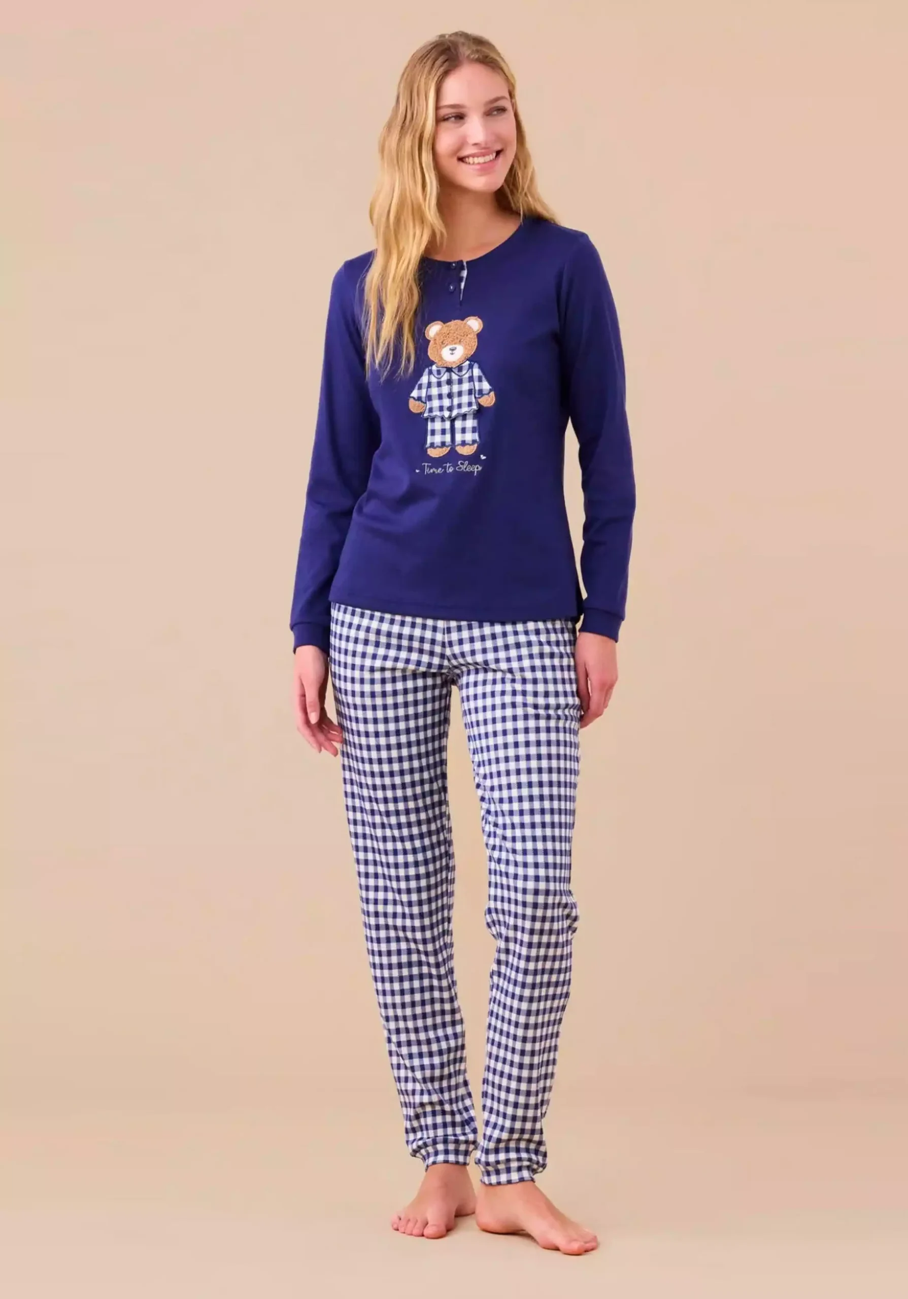 La maglia presenta una stampa simpatica con un tenero orsetto, simbolo di dolcezza e relax, su uno sfondo blu intenso che trasmette calma e serenità. I pantaloni coordinati, con una vestibilità comoda e fluida, completano il look con armonia e praticità, rendendo questo pigiama perfetto non solo per dormire, ma anche per trascorrere serate rilassanti in casa davanti a un film o un buon libro.
