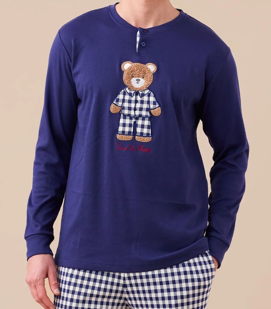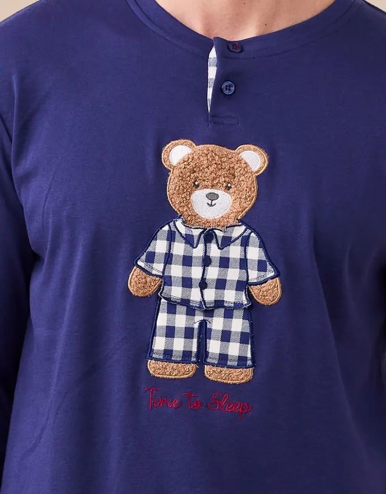 La maglia blu navy presenta un ricamo raffinato con l’immagine di un orso, simbolo di forza e tranquillità. Un dettaglio che aggiunge personalità e un tocco giocoso al look notturno. I pantaloni lunghi coordinati, con vestibilità comoda e vita elasticizzata, completano il design con una linea pulita e versatile.