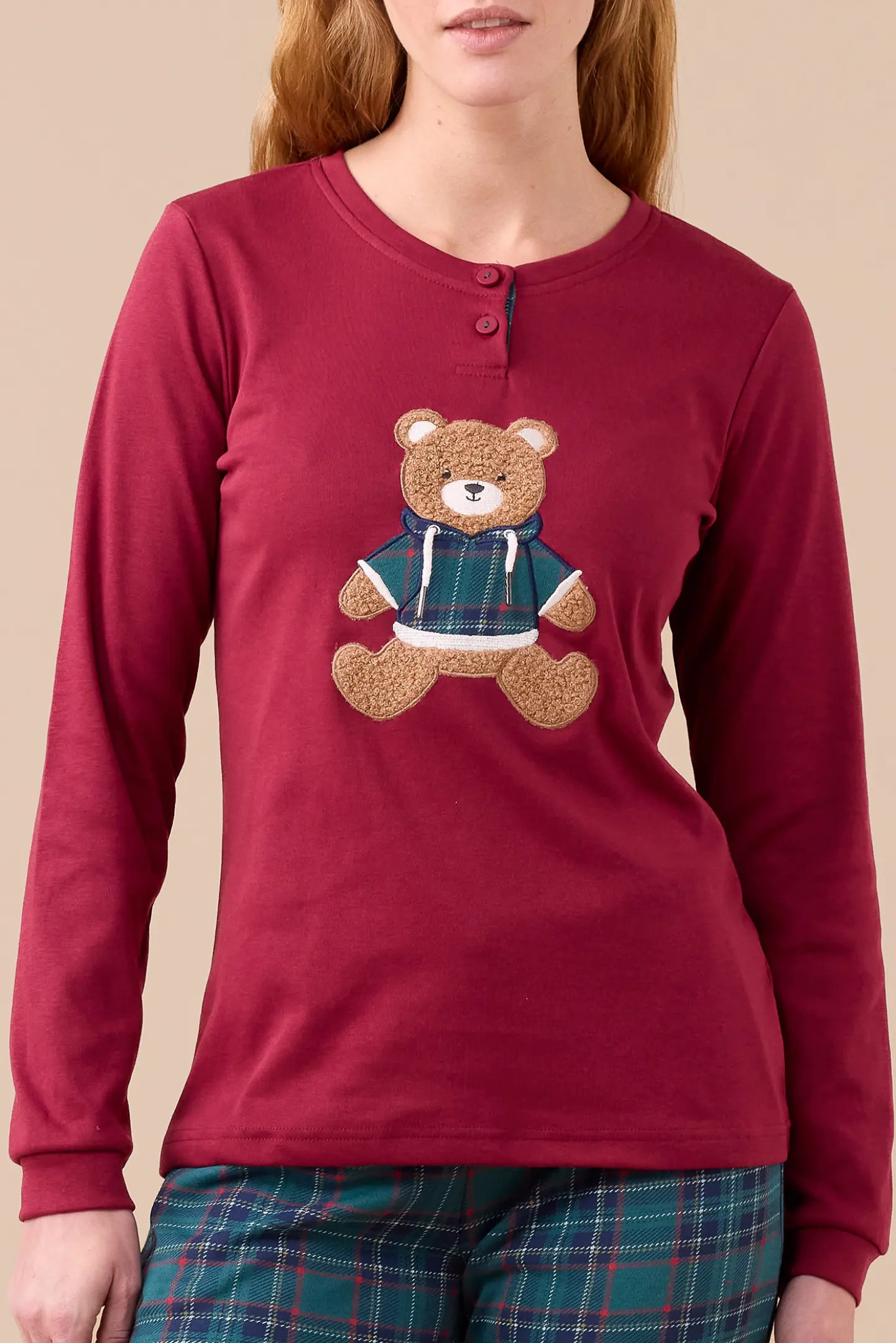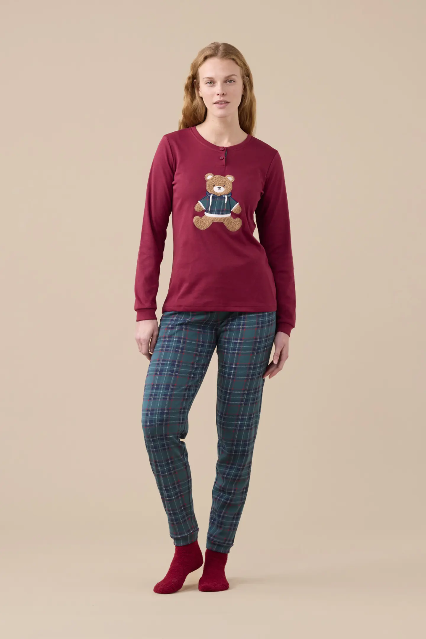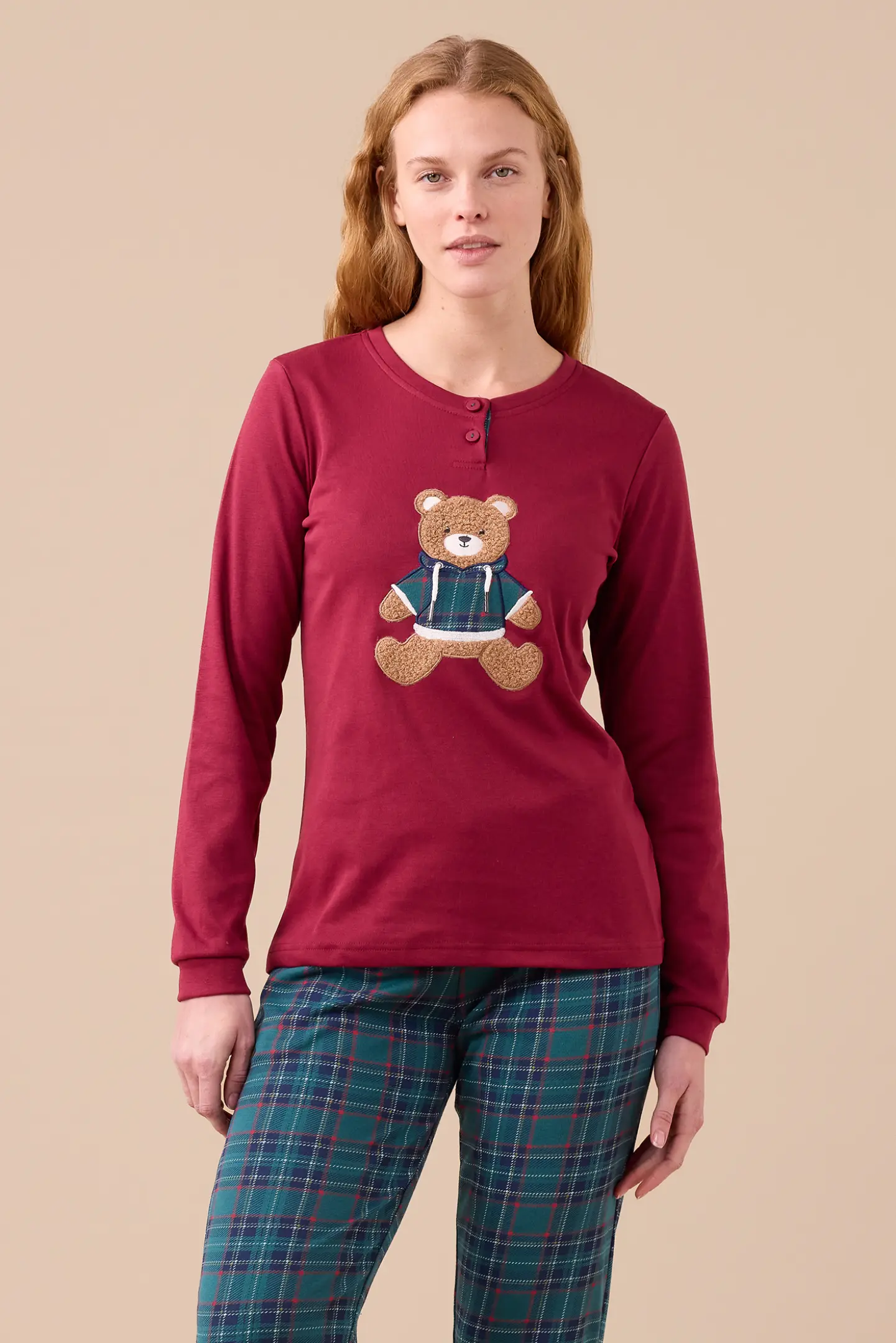 Realizzato in caldo cotone di alta qualità, questo pigiama garantisce traspirabilità e comfort termico anche nelle notti più fredde. La felpa in tinta unita, con la dolcissima stampa dell’orso scozzese, aggiunge un tocco di tenerezza e originalità, mentre i pantaloni lunghi a quadri scozzesi completano l’insieme con uno stile classico e sempre di tendenza. Il risultato? Un look da notte armonioso, accogliente e pieno di personalità.
