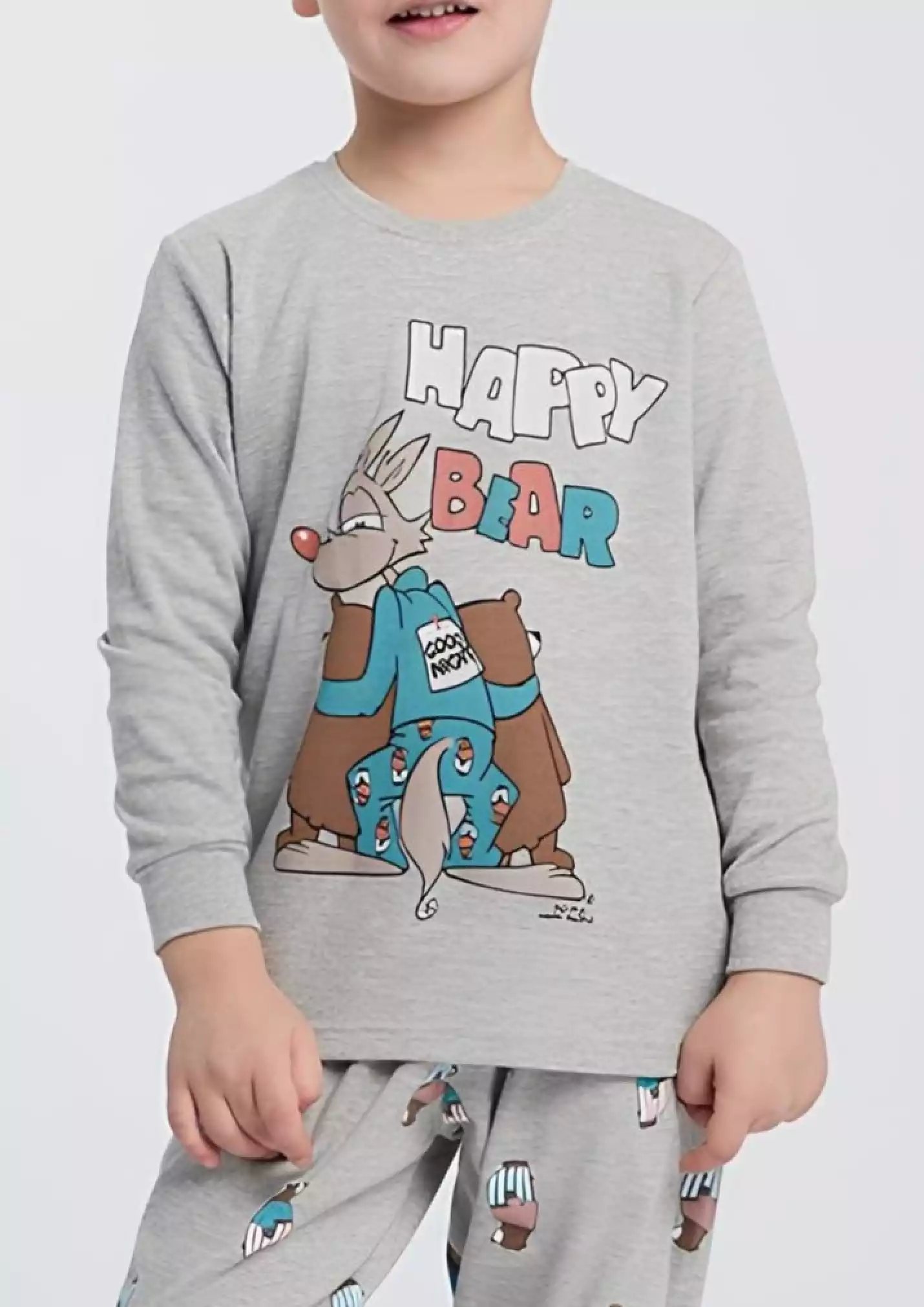 Realizzato in morbido cotone caldo, il tessuto accarezza la pelle garantendo traspirabilità e comfort ottimale durante il riposo. La maglia girocollo presenta una simpatica stampa “Happy Bear”, simbolo di dolcezza e relax, mentre il pantalone lungo coordinato completa il look con una fantasia a tema che aggiunge un tocco di allegria e originalità.