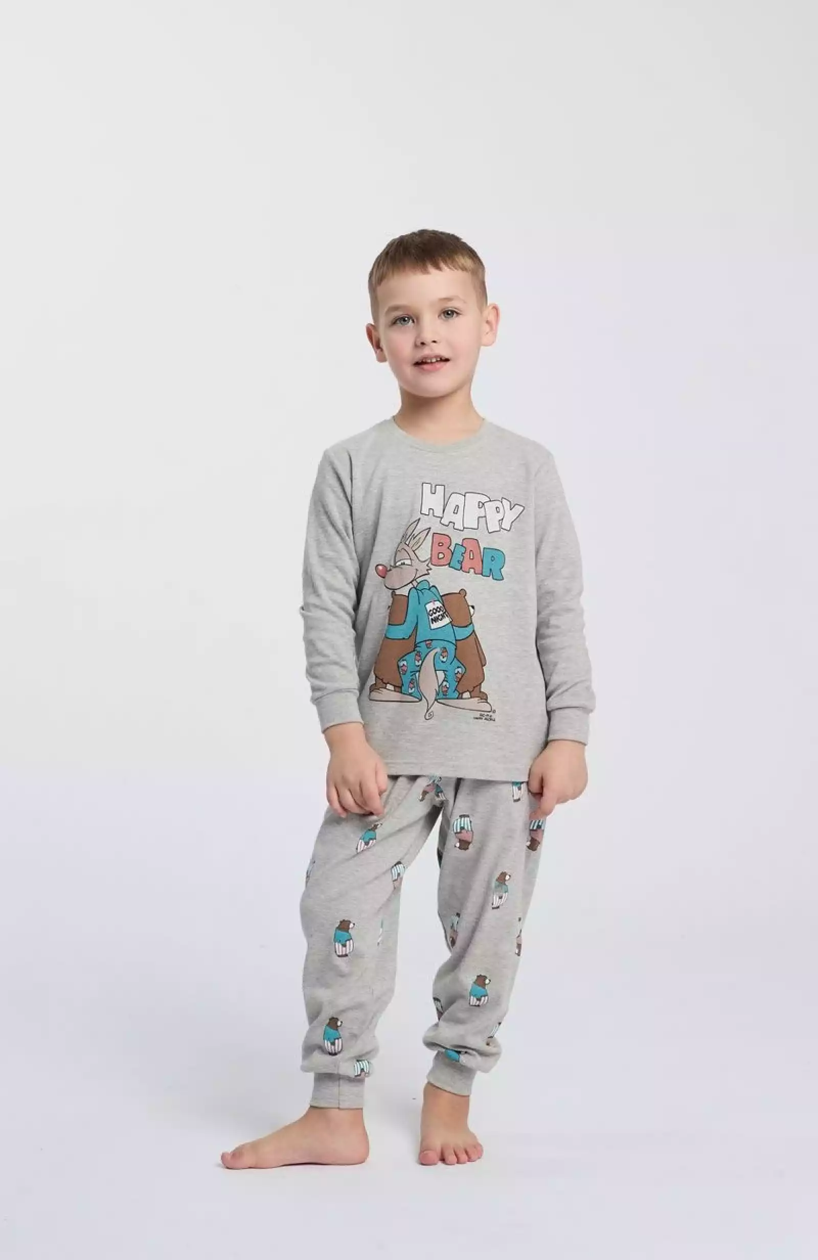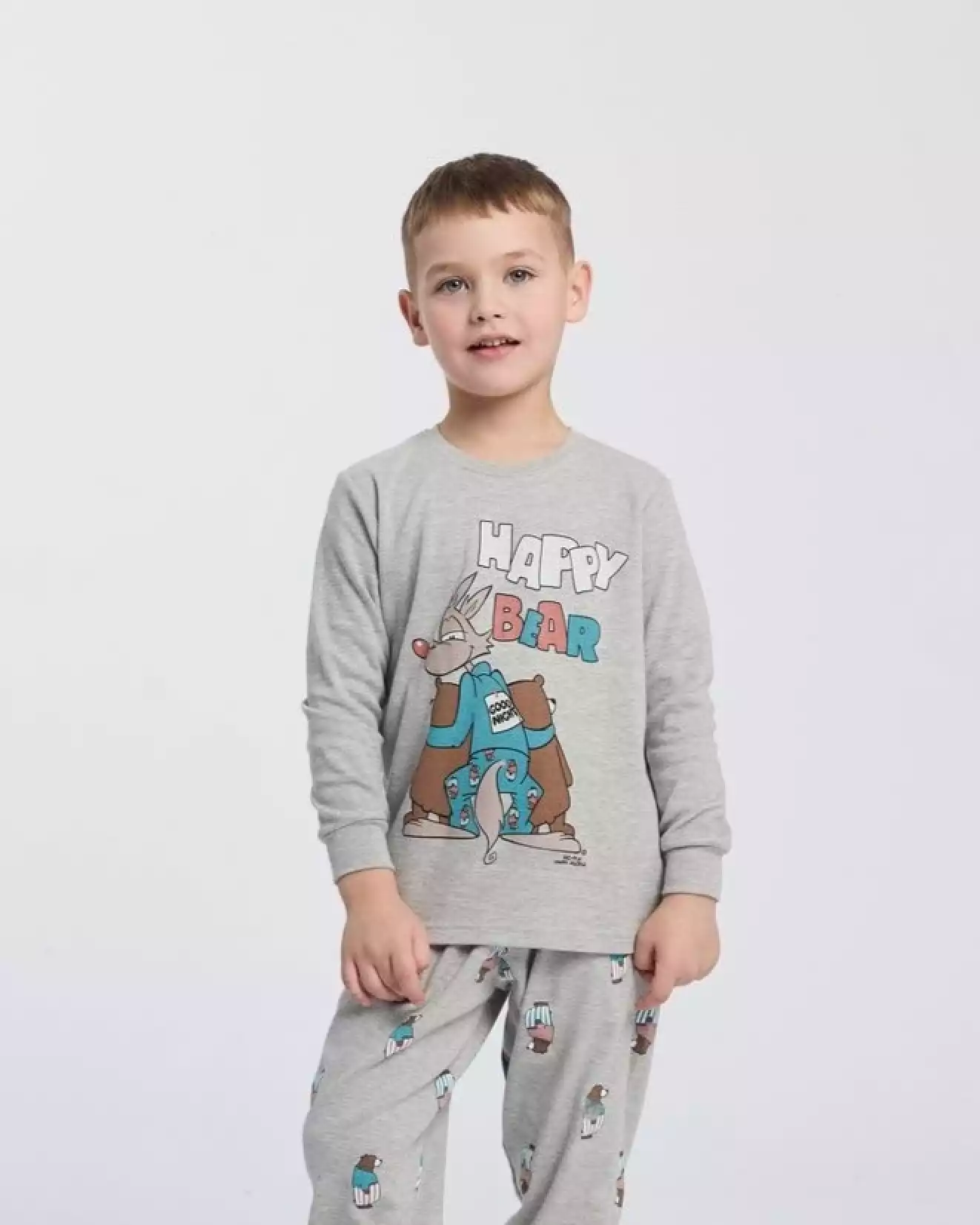 Il design, con girocollo classico e pantaloni a tinta unita con elastico in vita, assicura una vestibilità comoda e pratica, perfetta per muoversi liberamente anche durante il sonno. La parte superiore è impreziosita dalla stampa “Happy Bear”, orsetti e coniglio che trasmettono positività e serenità, perfetto per chi ama iniziare e concludere la giornata con il sorriso.