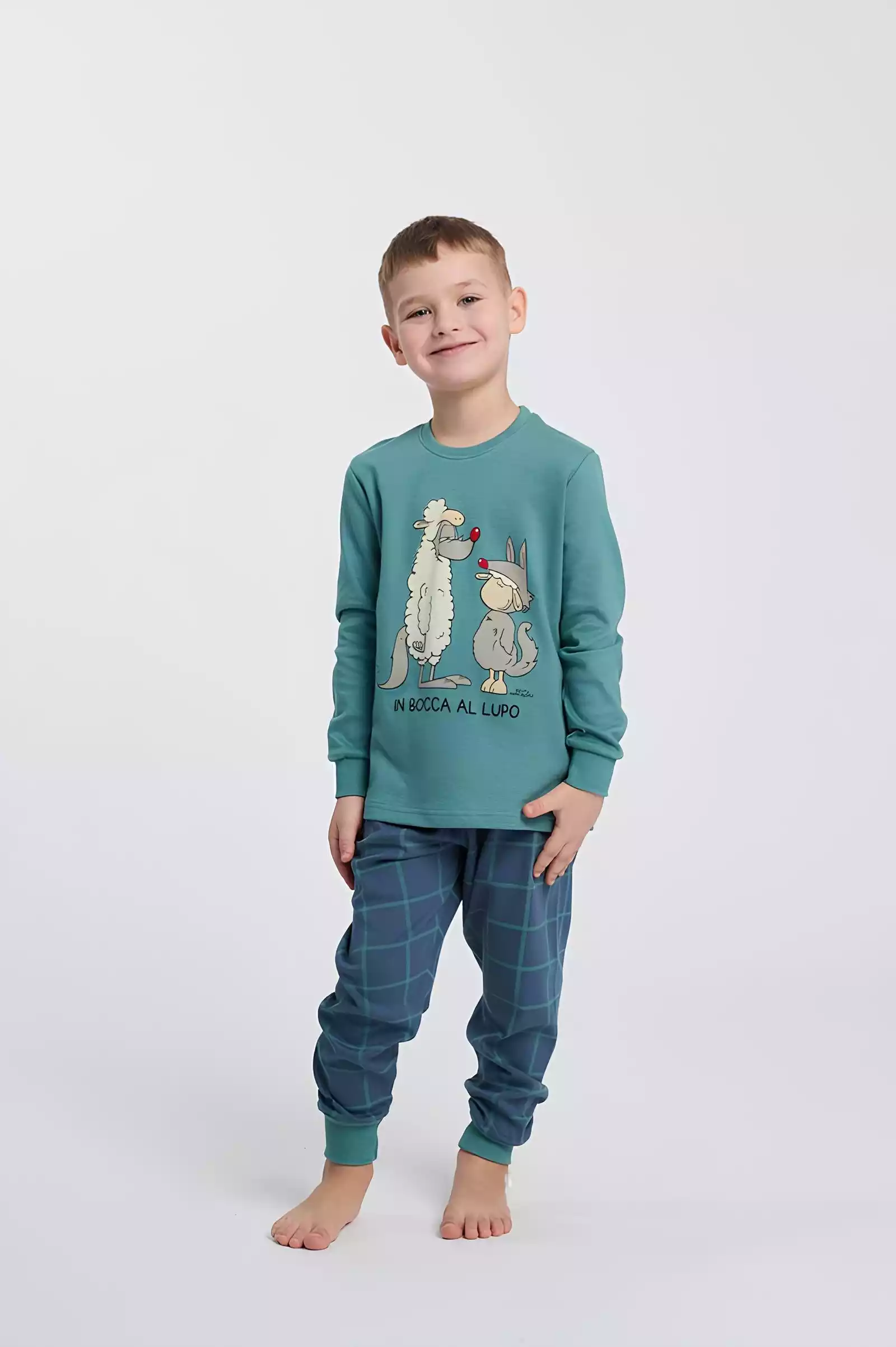 Il modello presenta una maglia a girocollo con simpatica stampa “In bocca al lupo” accompagnata da dolci motivi illustrati, abbinata a un pantalone lungo con elastico in vita per la massima libertà di movimento. Ogni dettaglio è studiato per unire praticità e stile, in perfetto equilibrio tra comfort e allegria.