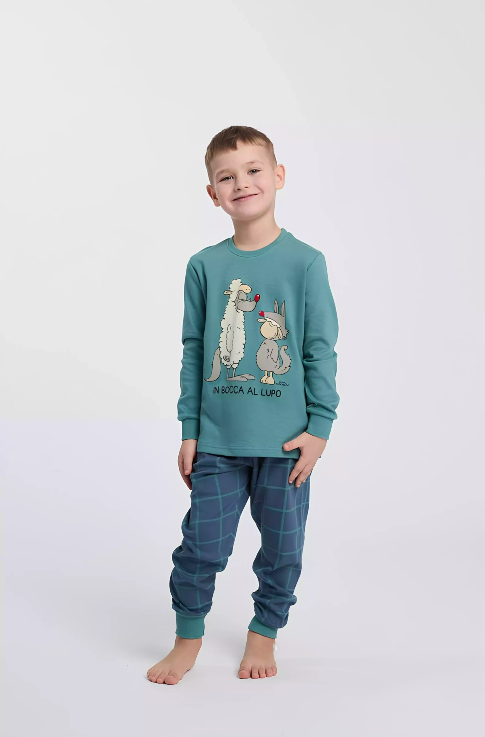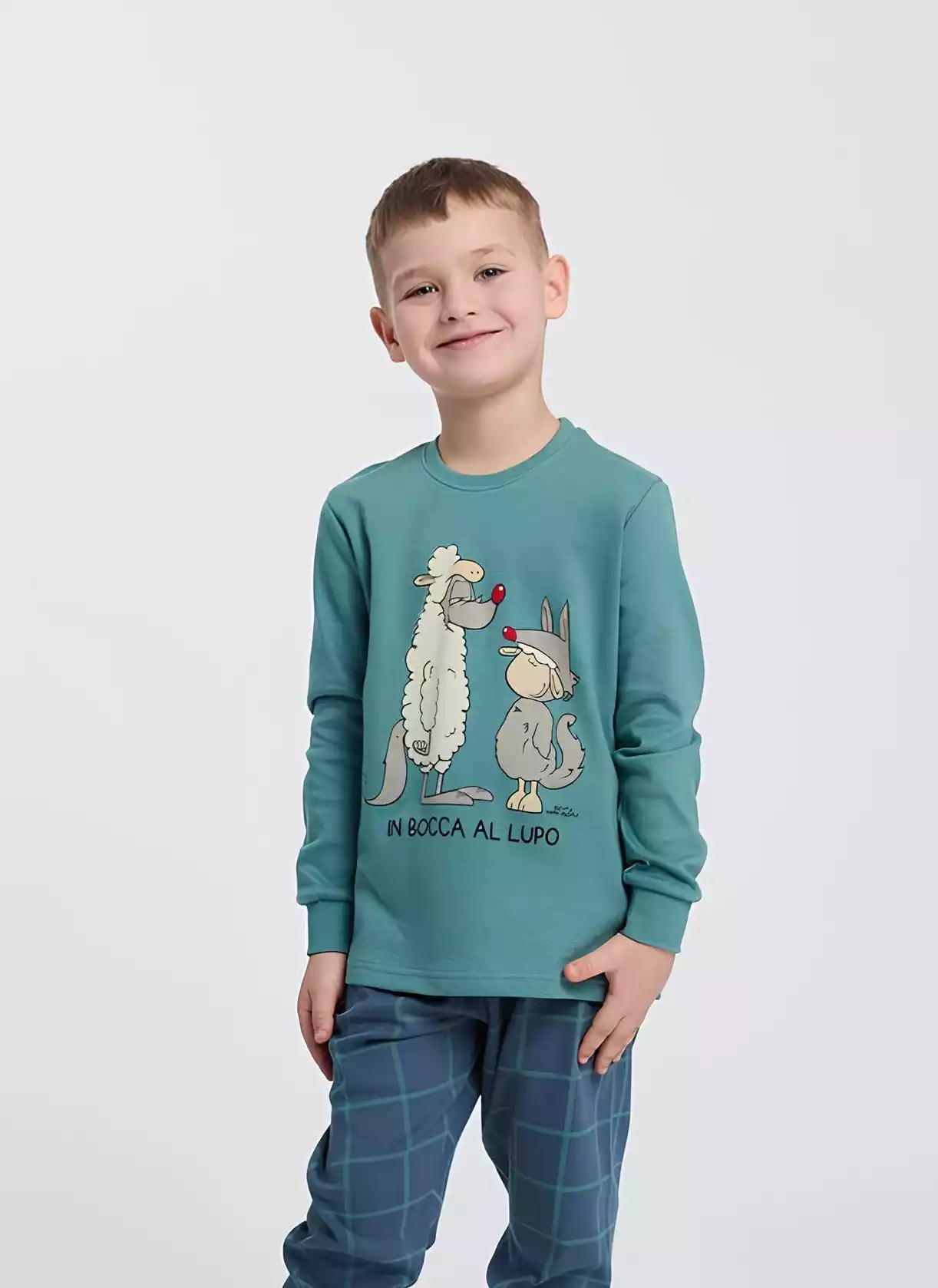 Realizzato in morbido cotone interlock, un tessuto noto per la sua elasticità naturale e la capacità di mantenere il calore, questo pigiama è perfetto per accompagnare i più piccoli durante le notti più fredde. La maglia a girocollo presenta una stampa divertente e colorata con il simpatico lupo protagonista, simbolo di coraggio e buon augurio, e la scritta “In bocca al lupo” che rende il capo ancora più unico e affettuoso.